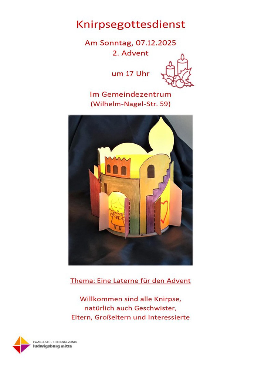 Seit 1. Jan 2025 bilden wir mit zusammen mit Martinskirche (Grünbühl), Stadtkirche und der Friedenskirche die Evangelische Kirchengemeinde Ludwigsburg Mitte – Wir sind Mitglied der Gesamtkirchengemeinde Ludwigsburg.
